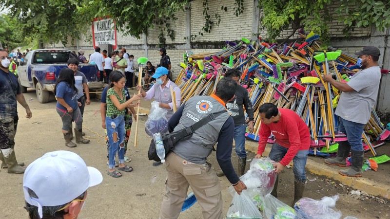 En total, se entregaron 217 paquetes que incluían dos escobas y dos palas cada uno, además de mil cubetas, 381 kits de limpieza y 63 unidades de detergente multiusos, artículos indispensables para las tareas de desinfección en hogares que permanecen llenos de lodo y residuos.